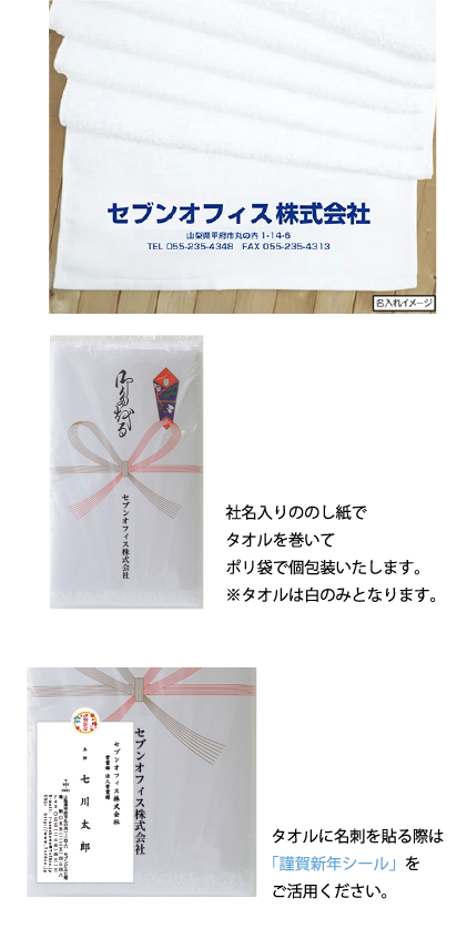 お年賀品の人気ナンバーワン!年始ご挨拶用の「名入れタオル」です。泉州産の上質な白タオルに、紺色で名入れします。